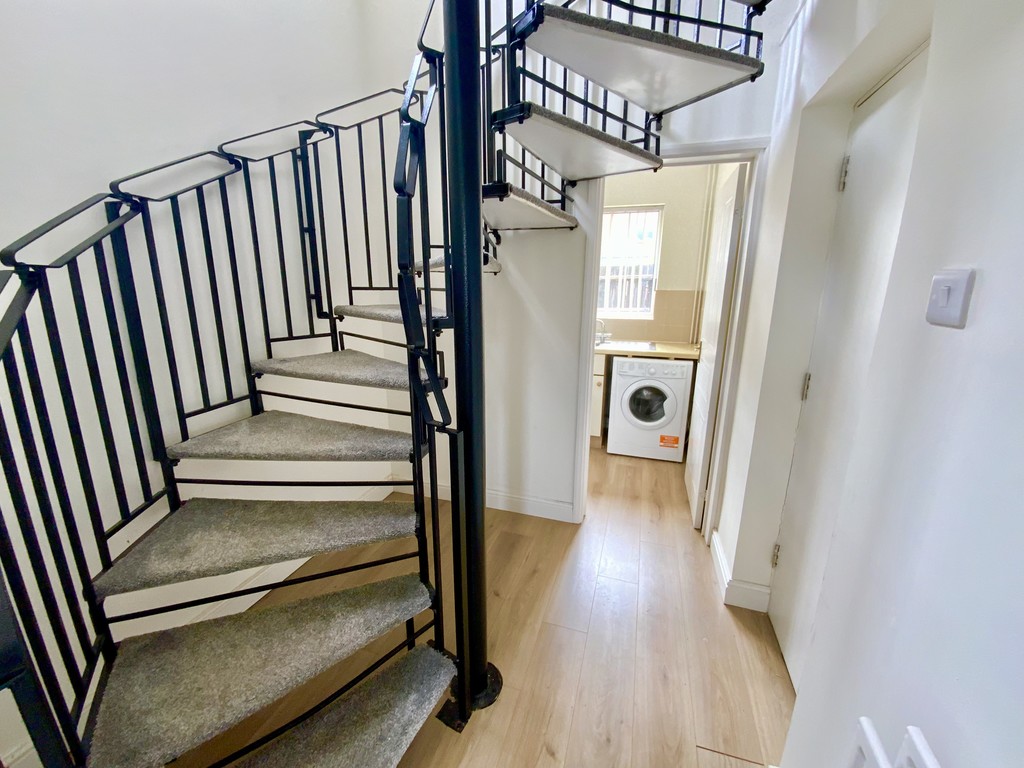 ENTRANCE HALL Laminate floor, spiral staircase to first floor, radiator, door into garage, door into: