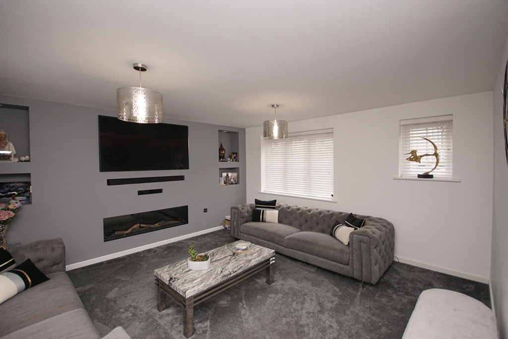 LOUNGE/SITTING ROOM 14' 11" x 13' 9" (4.55m x 4.19m) Two PVCu double glazed windows overlooking front of property, fully glazed patio doors with full length window to side leading to patio and rear garden, media wall incorporating space and connection for TV sound bar, integral fire, shelving with lighting, double radiator.
