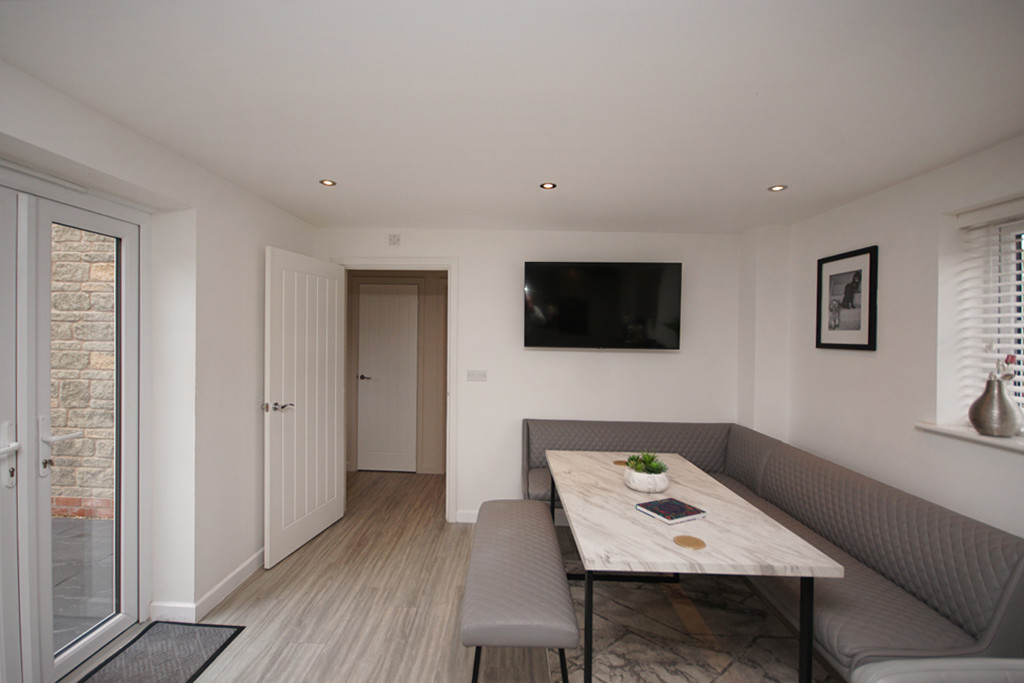 KITCHEN/DINING/FAMILY ROOM 22' 4" x 11' 3" (6.81m x 3.43m) PVCu double glazed patio doors leading to patio and rear garden, three windows to sides, range of sage wall and base units with under cabinet lighting, grey work surface over and upturns, eye level oven and grill, stainless steel five gas burner hob with glass splashback, stainless steel cooker hood with light and extractor, one and a half bowl stainless steel sink and drainer with mixer tap, integrated dishwasher, integrated fridge/freezer, integrated washing machine, central island with breakfast bar and further cupboards, double radiator, low level LED lighting, downlighters, wall mounted extractor fan, fitted smoke alarm, TV aerial connection point.