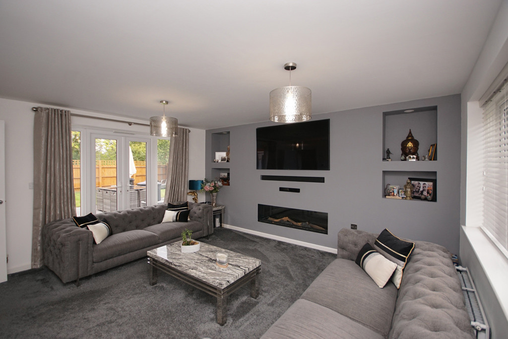 LOUNGE/SITTING ROOM 14' 11" x 13' 9" (4.55m x 4.19m) Two PVCu double glazed windows overlooking front of property, fully glazed patio doors with full length window to side leading to patio and rear garden, media wall incorporating space and connection for TV sound bar, integral fire, shelving with lighting, double radiator.