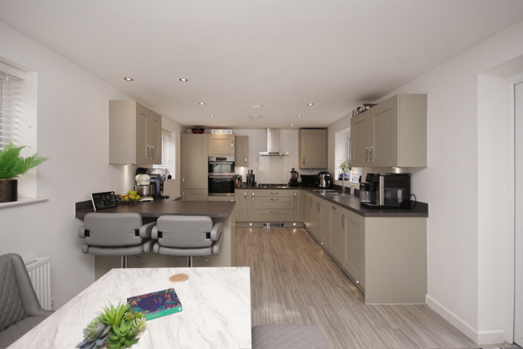 KITCHEN/DINING/FAMILY ROOM 22' 4" x 11' 3" (6.81m x 3.43m) PVCu double glazed patio doors leading to patio and rear garden, three windows to sides, range of sage wall and base units with under cabinet lighting, grey work surface over and upturns, eye level oven and grill, stainless steel five gas burner hob with glass splashback, stainless steel cooker hood with light and extractor, one and a half bowl stainless steel sink and drainer with mixer tap, integrated dishwasher, integrated fridge/freezer, integrated washing machine, central island with breakfast bar and further cupboards, double radiator, low level LED lighting, downlighters, wall mounted extractor fan, fitted smoke alarm, TV aerial connection point.