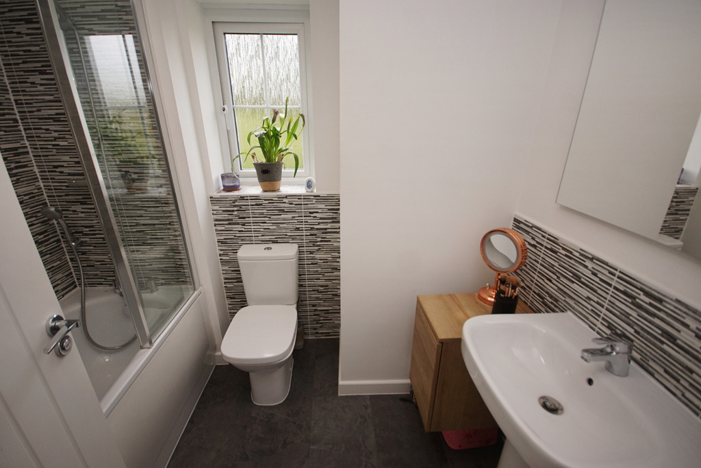DOWNSTAIRS CLOAKROOM PVCu double glazed window with obscure glass, wall mounted wash hand basin with tiled splashback and mixer tap, close coupled WC, ceiling mounted extractor, Brampton Chase LVT flooring.