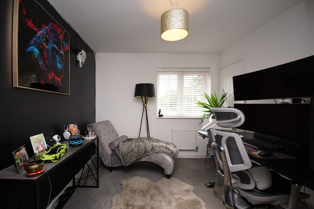 RECEPTION TWO 11' 1" x 9' 11" (3.38m x 3.02m) Dual aspect double glazed windows to front and side overlooking open green areas, feature wall, electrical consumer box unit, double radiator.