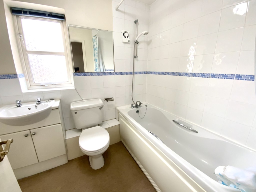 BATHROOM White suite comprising panelled bath with shower and rail, WC, vanity unit with inset wash hand basin, opaque double glazed window to rear, radiator.