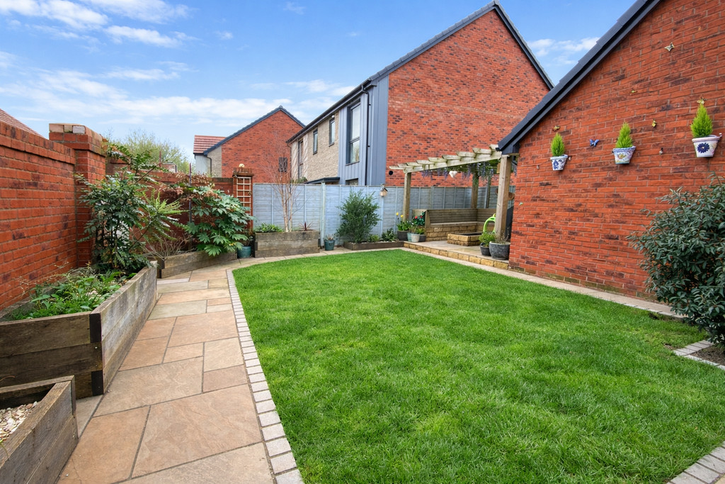 REAR GARDEN South Facing Patio to immediate rear leading to a level lawn, patio surrounding the lawn, further patio, pergola, raised bench seating, outside cold tap, outside power, door into garage, side gate.