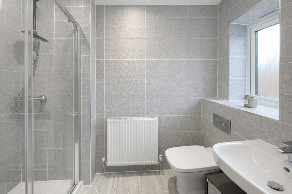 BATHROOM Partially tiled walls, white suite comprising panelled bath with thermostatic shower and screen, WC, wash hand basin, opaque double glazed window to side, shaver point, stainless steel towel radiator, extractor fan.