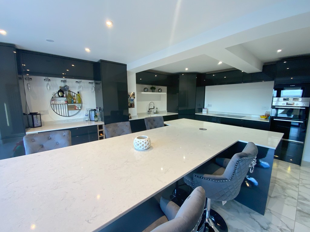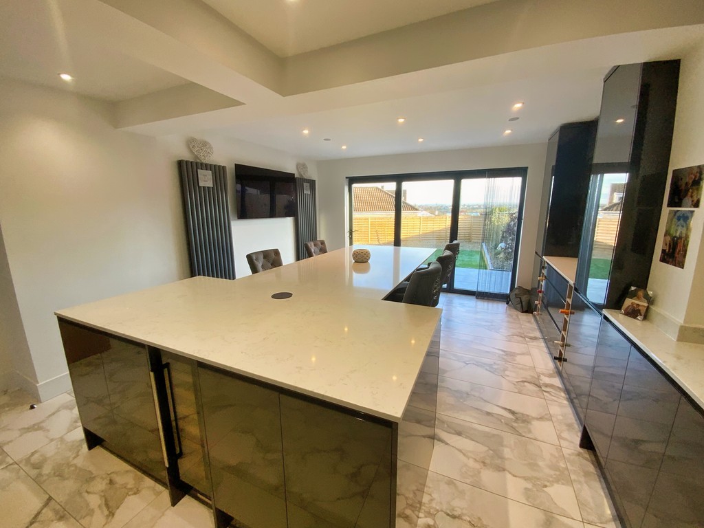 KITCHEN/DINING/FAMILY ROOM 19' 4" x 15' 10" max (5.89m x 4.83m) Bi-fold doors leading to patio and rear garden, range of high gloss wall and base units with granite work surface over, large central island with breakfast bar, eye level 'Bosch' oven and grill with microwave above, 'Bosch' induction hob with stainless steel extractor and light above, inset Belfast style sink with stainless steel hot water flexi tap over, integrated full length fridge and full length freezer, downlighters, low-level LED lighting, ceiling mounted Bluetooth speaker, two contemporary style vertical radiators, tv aerial connection point, porcelain tiled flooring.