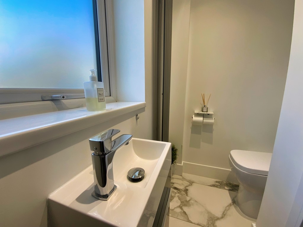 UTILITY/CLOAKROOM UPVC double glazed window with obscure glass, rectangle wash hand basin with mixer tap over and storage below, close coupled WC, contemporary style vertical radiator, porcelain tiles, electrical consumer box unit, space and plumbing for washing machine, space and vent for tumble dryer, downlighters.