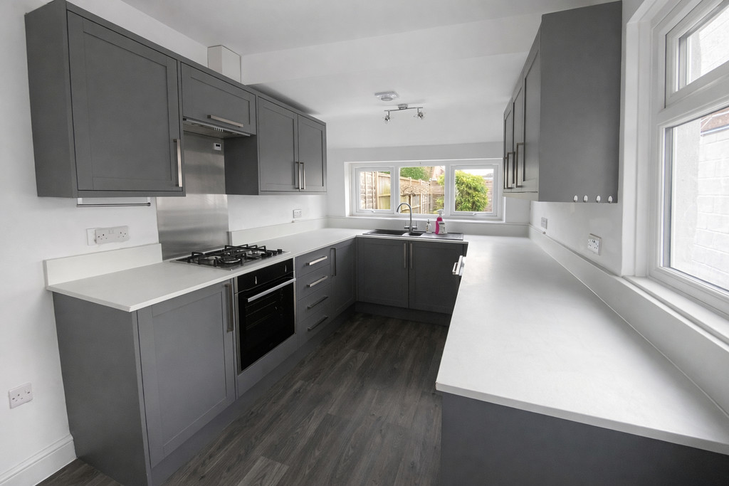 KITCHEN 13' 1" x 7' 9" (3.99m x 2.36m) Shaker style wall, base and drawer units with marble work surface and upstands, built-in electric oven and stainless steel gas hob with matching splash panel and extractor hood over, one and a half bowl single drainer sink unit with mixer tap, integrated dishwasher, space for fridge/freezer, double glazed window to side and rear, half double glazed UPVC door leading to rear garden, radiator, extractor fan.