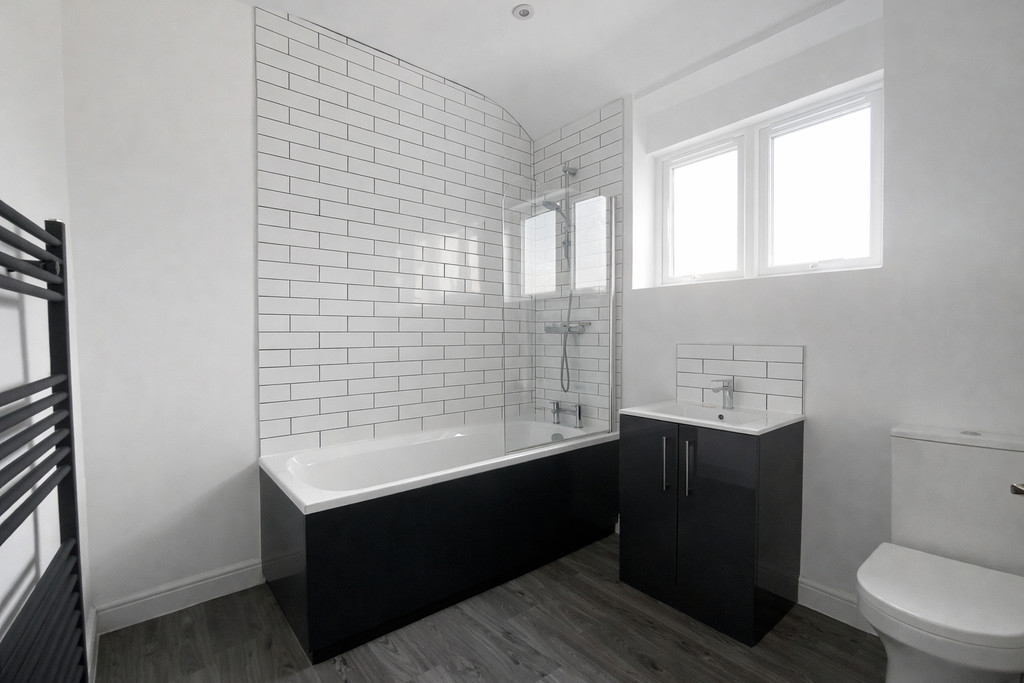 BATHROOM White suite comprising panelled bath with tiled surround with shower and screen, vanity unit with inset wash hand basin and tiled splashback, WC, towel radiator, opaque double glazed window to side, extractor fan.
