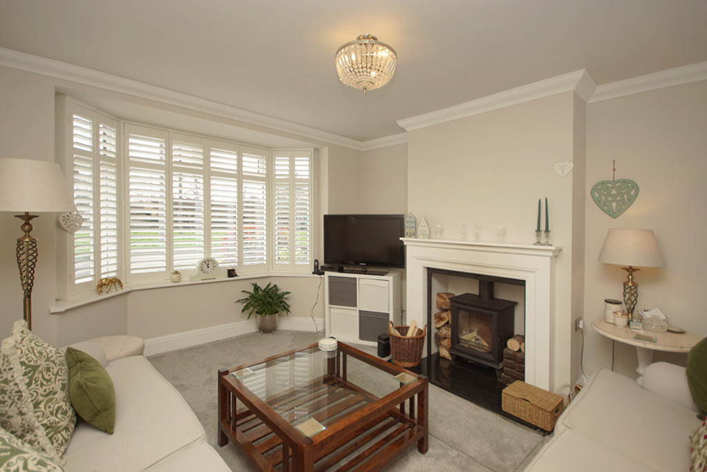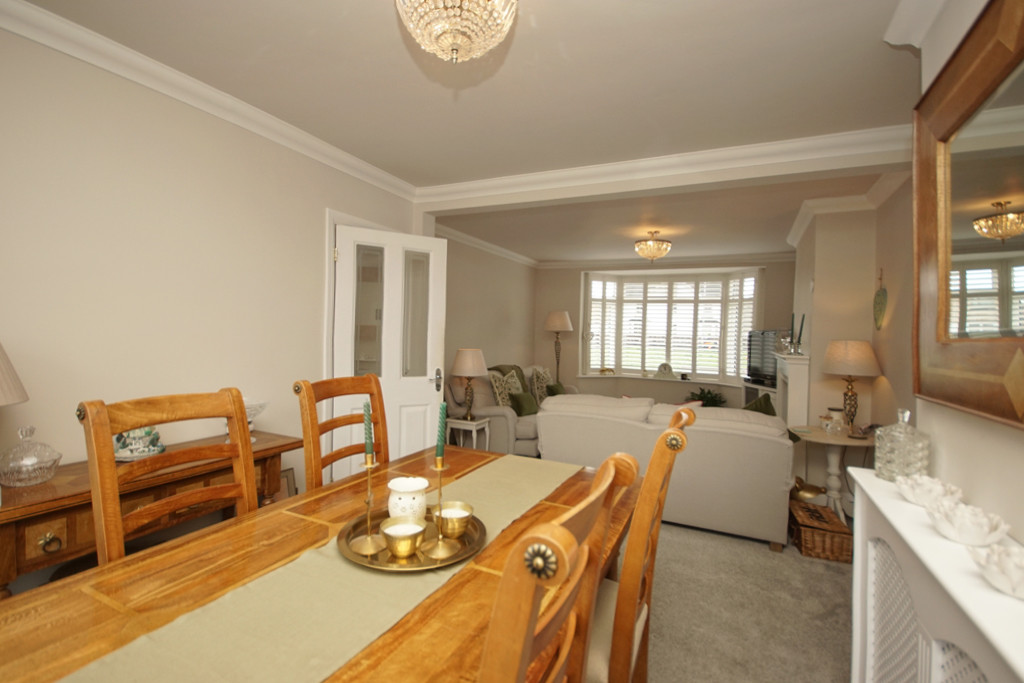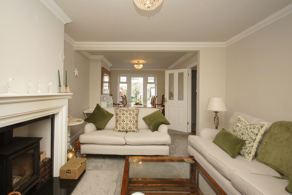 LOUNGE/DINER 12' 6" into bay x 10' 4" (3.81m x 3.15m) PVCu bay window to front of property, PVCu fully glazed French doors with full length windows to side leading to patio and rear garden, feature wood fireplace with inset wood burner and marble effect hearth, t.v aerial connection point, coved ceiling, two double radiators.