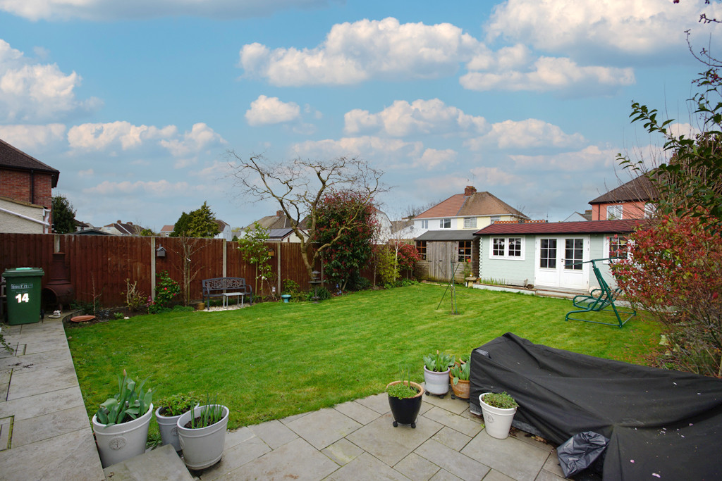 REAR GARDEN Fully enclosed via fencing, mainly laid to lawn, two patios, outside tap, well tended mature borders with shrubs, bushes and small trees, outside lighting, pedestrian access to side of house, wooden gate leading to front patio, bin storage area.