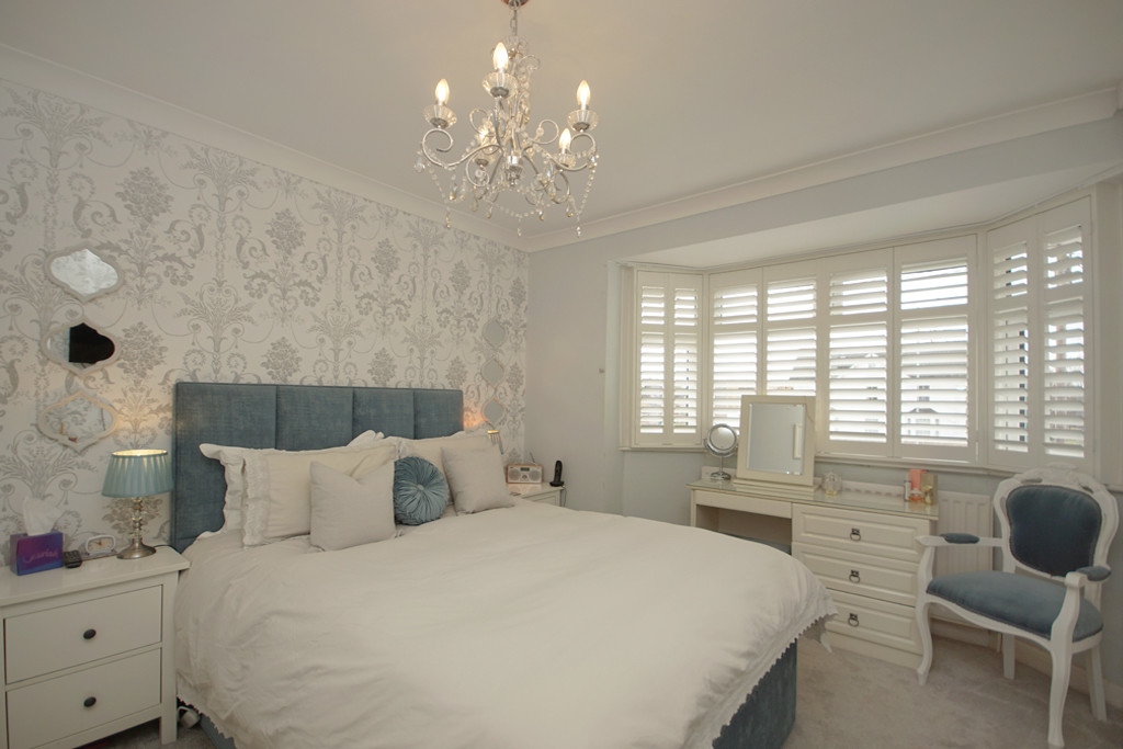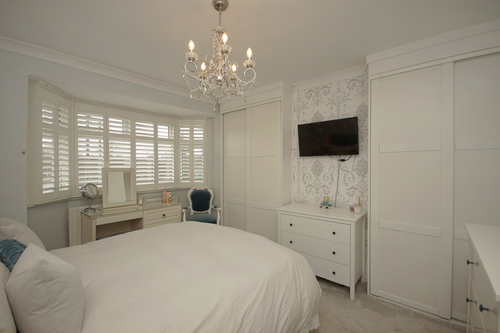 BEDROOM ONE 13' 10" into bay x 11' 0" (4.22m x 3.35m) PVCu bay window overlooking front of property, fitted wardrobes providing hanging and shelving, t.v aerial connection point, radiator.