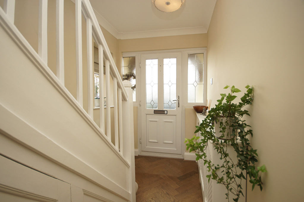 HALLWAY Double glazed window to side, stairs to first floor, two understairs cupboard, two radiators, coved ceiling, solid oak herringbone flooring. Oak door to kitchen.