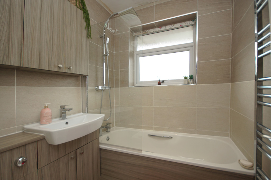 BATHROOM PVCu double glazed window with obscure glass, fully tiled walls, white suite comprising panelled bath with mixer taps, over bath shower with rain head shower and shower attachment, fitted shower screen, vanity unit with inset wash hand basin and mixer tap, close coupled w.c, wall mounted cupboard, downlighters, laminated flooring, stainless steel radiator/towel warmer, ceiling mounted extractor fan.