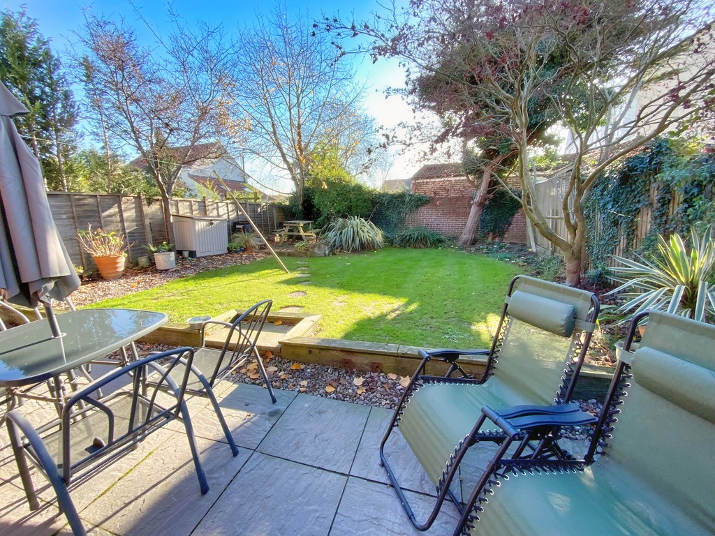 REAR GARDEN South-East Facing Fully enclosed via walling and fencing, mainly laid to lawn, borders with mature borders, shrubs and small trees, full-width patio, outside tap, further patio area, access to front of property vias wooden side gate,