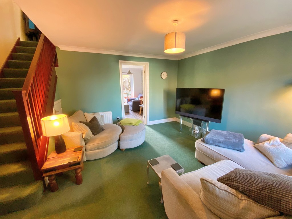 LOUNGE 14' 8" x 12' 8" including stairs (4.47m x 3.86m) Double glazed window overlooking front of property, stairs to first floor with storage cupboard under, double panelled radiator, TV aerial connection point, coving.