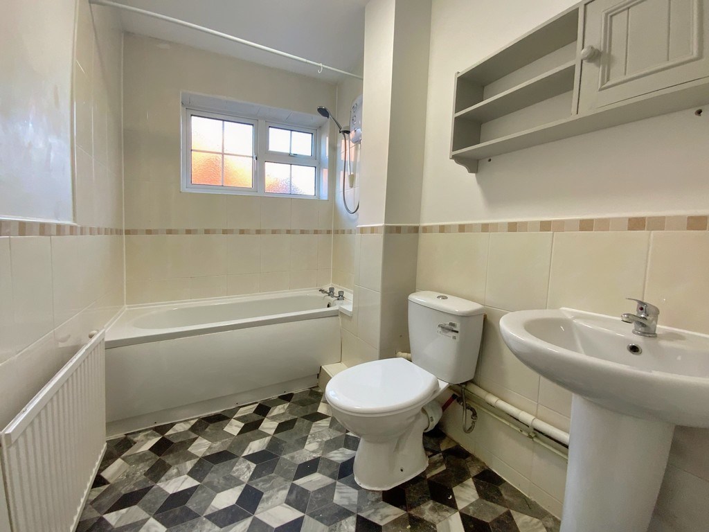 BATHROOM White suite comprising panelled bath with electric shower over, WC, pedestal wash hand basin, half tiled walls, radiator, opaque double glazed window to side.