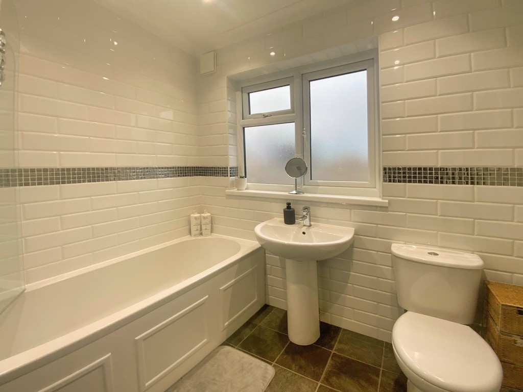 BATHROOM PVCu double glazed obscure window to rear, panelled bath with shower attachment, pedestal wash hand basin, WC, wall mounted heated towel rail, three tiled walls, wall mounted extractor fan, coved ceiling.