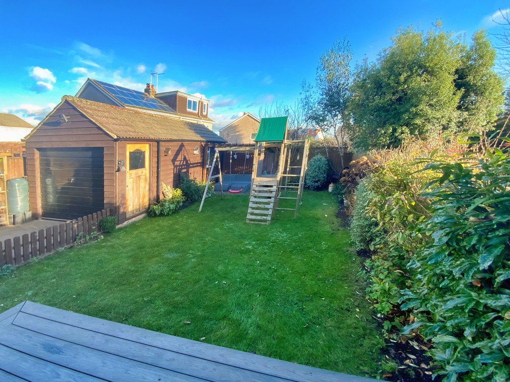 REAR GARDEN Laid to lawn, raised decking area with steps leading to the house, patio area, flower borders, outside tap.