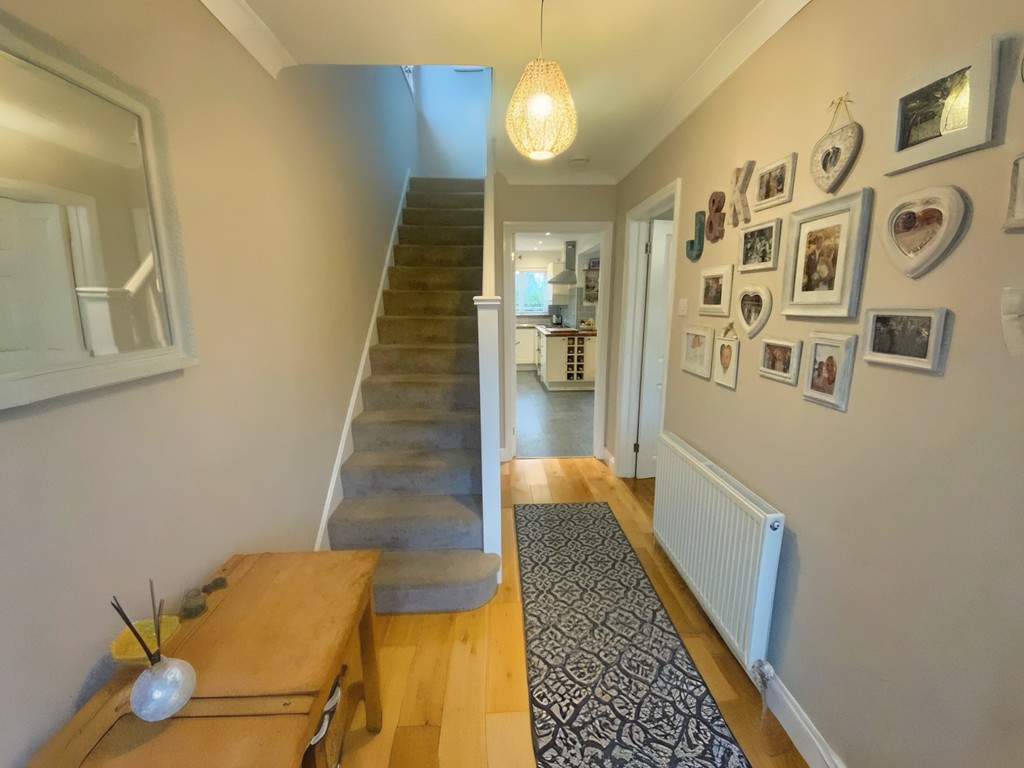 HALLWAY Stairs to first floor, radiator, under stairs storage cupboard, coved ceiling, oak flooring.