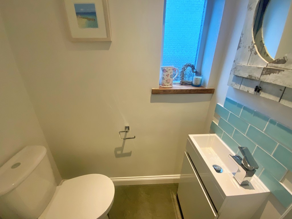 CLOAKROOM PVCu double glazed obscure window to side, vanity unit with inset wash hand basin and tiled splashback, WC, radiator.