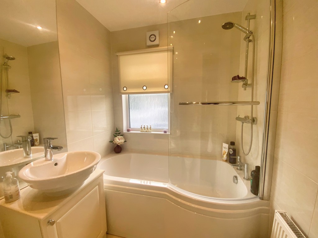 BATHROOM Tiled walls and floor, 'P' shaped bath with shower and screen, vanity unit with inset wash hand basin, WC, radiator, opaque double glazed window, extractor fan.
