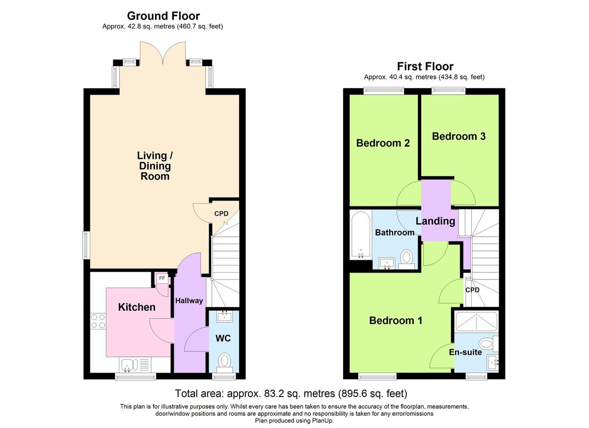 Accommodation comprises hallway, cloakroom, kitchen and living/dining room to the ground floor with three bedrooms, ensuite shower room and bathroom to the first.