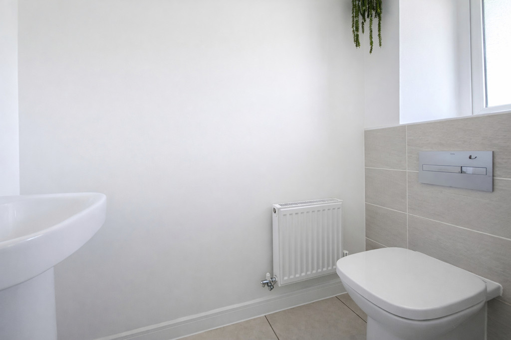 CLOAKROOM Tiled floor, opaque double glazed window to front, WC, pedestal wash hand basin with tiled splashback.