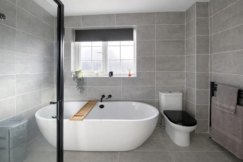 BATHROOM Tiled walls and floor, free standing oval bath, tiled shower cubicle, WC, vanity unit with inset wash hand basin, towel radiator, opaque double glazed windows to side and rear, extractor fan and light.