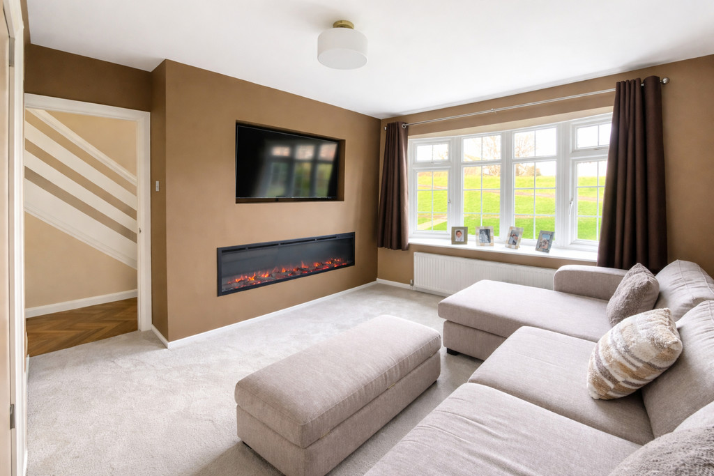 LOUNGE 13' 6" x 12' 0" (4.11m x 3.66m) Double glazed bowed window to front, full height media wall with space for TV and inset log effect ribbon fire, radiator.