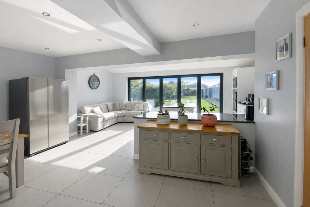 KITCHEN/LIVING/DINING ROOM 20' 4" x 18' 4" (6.2m x 5.59m) Tiled floor, double glazed bi-fold doors across the entire width, fitted with shaker style wall, base and drawer units with roll edge work surface and upstands, island unit with cupboards and drawers, built-in Zanussi double oven and Beko microwave, stainless steel 5 ring gas hob with splash panel and extractor chimney over, inset one and a half bowl sink unit with mixer tap, integrated dishwasher, space for washing machine, two radiators, two Velux windows to rear roof slope and inset spotlights.