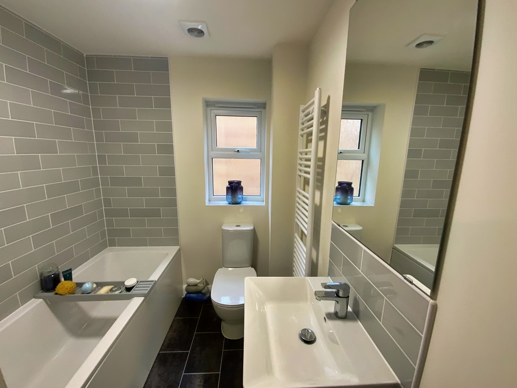 BATHROOM Vinyl tiled floor, white suite comprising WC, panelled bath with tiled surround, pedestal wash hand basin with tiled splashback, towel radiator, extractor fan.