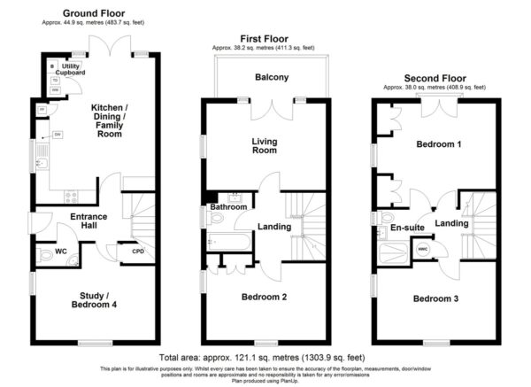 The property offers flexible accommodation over the three floors to utilise as a three or four bedroom property with many of the rooms having dual aspect windows to make the most of natural light. To the ground floor is the entrance hall, cloakroom, kitchen/living/dining room and study/bedroom 4. To the first floor is the living room that also has a balcony, plus bathroom and bedroom 2. To the second floor is the master bedroom and ensuite shower room together with bedroom 3.