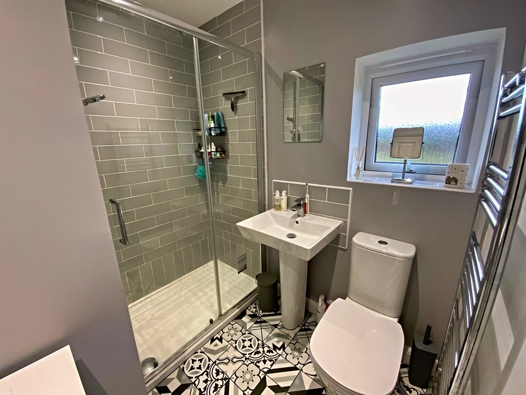 ENSUITE SHOWER ROOM Tiled floor, tiled shower cubicle, WC, pedestal wash hand basin with tiled splashback, opaque double glazed window to side, stainless steel towel radiator, shaver point, Jack-and-Jill doors, opaque double glazed window to side.