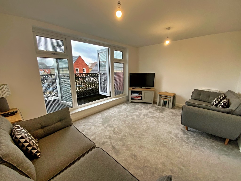 LIVING ROOM 14' 5" x 10' 5" (4.39m x 3.18m) Dual aspect double glazed windows and French doors onto a walled balcony with railings, two radiators.