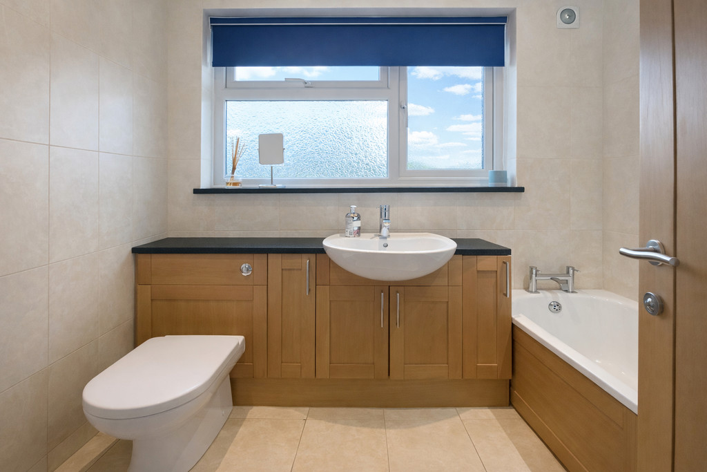 BATHROOM Tiled walls and floor, white suite comprising panelled bath with shower and screen, WC, vanity unit with inset wash hand basin, stainless steel towel radiator, opaque double glazed window to rear, extractor fan.