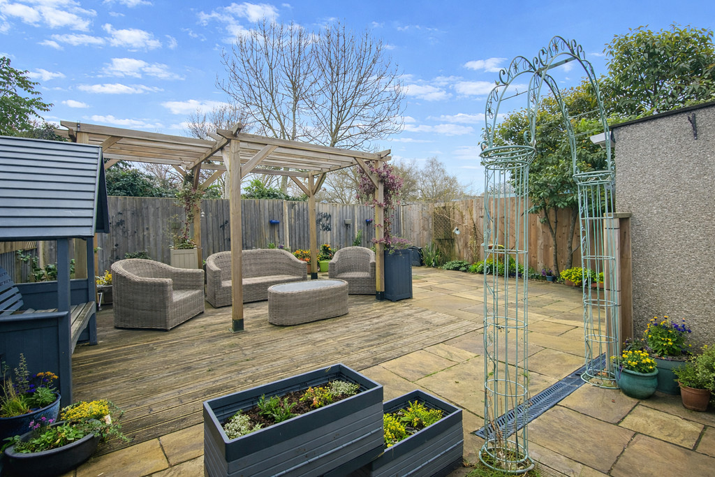 REAR GARDEN Three parts, interlocking patio bricks leads to patio and lawn then onto a part patio and decked seating area, side gate, outside cold tap.